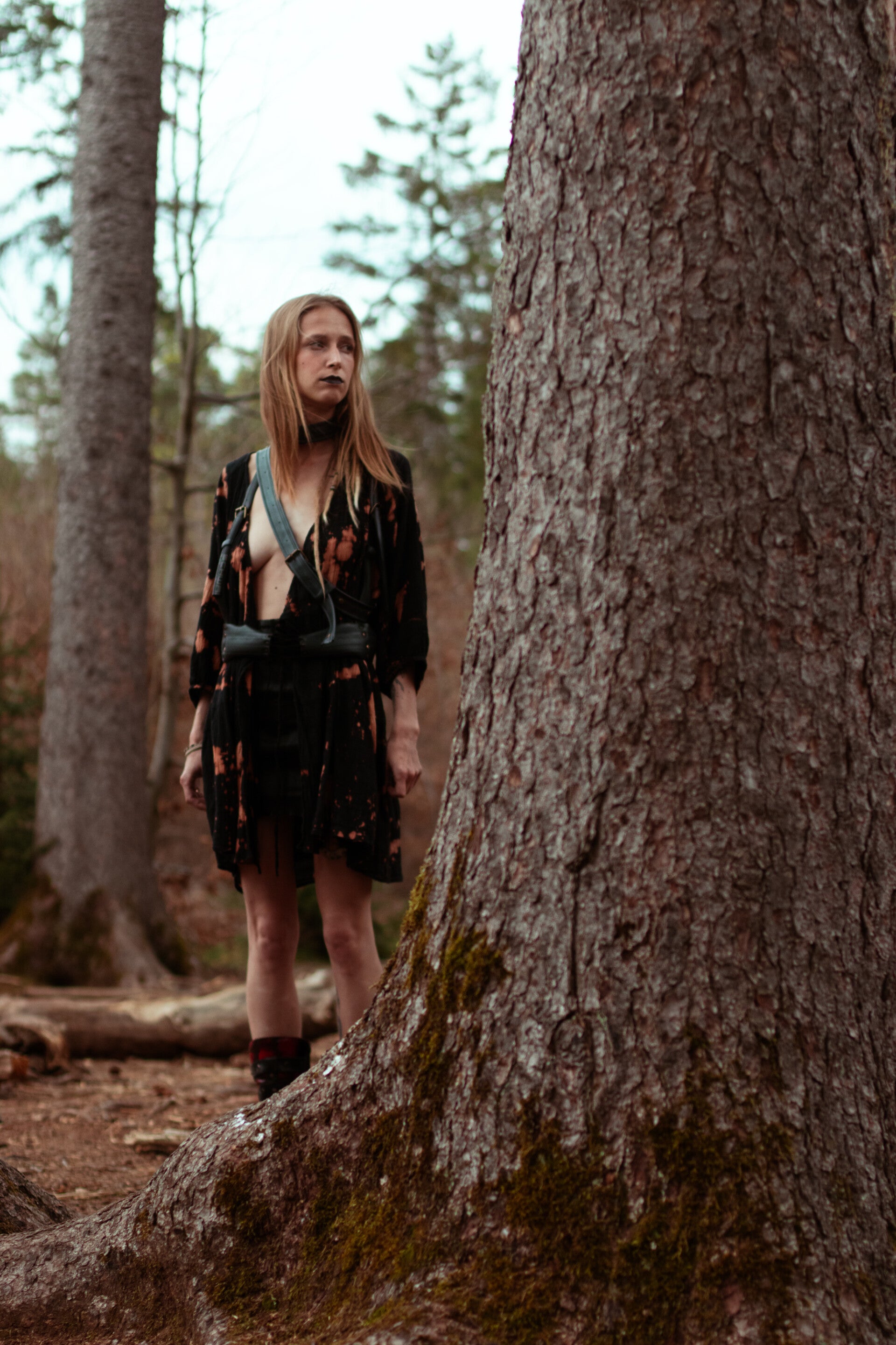 Der weite Schnitt mit 3/4-Ärmeln, tiefer Knopfleiste und Tunnelzug in der Taille macht das Kleid vielseitig tragbar – ob locker fließend oder figurbetont gebunden. Der Used-Look trifft auf DIY-Attitüde und lädt zum Layering mit Accessoires oder Statement-Harnesses ein.
