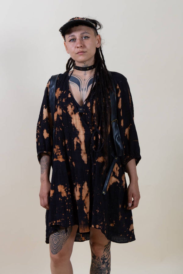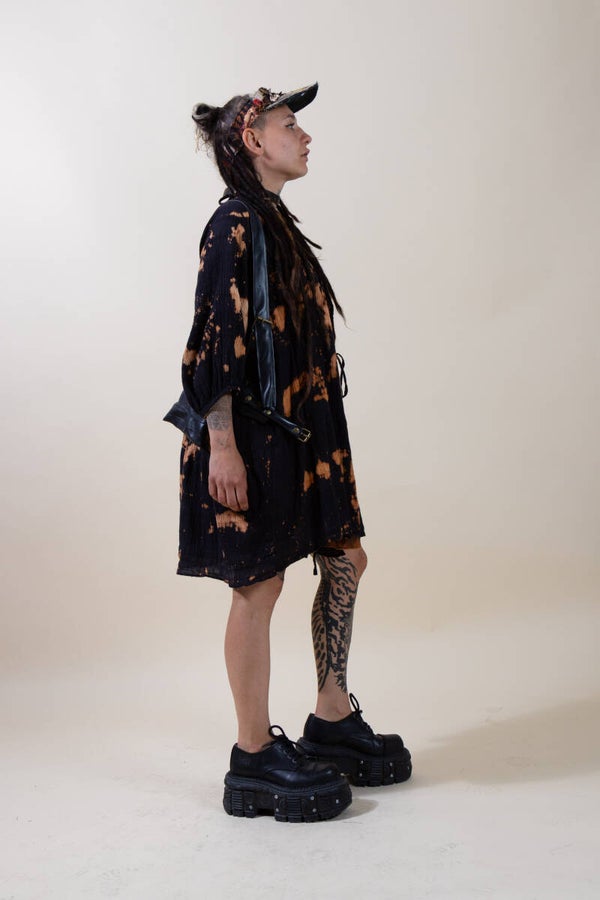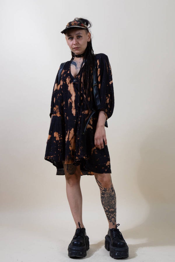 Dieses locker fallende Kleid vereint Komfort, Charakter und Individualität. Aus weicher, luftiger Baumwolle gefertigt, wurde es per Hand im Bleach-Dye-Verfahren veredelt – so entsteht ein einzigartiges Muster aus orangenen Sprenkeln und Verläufen auf tiefschwarzem Grund. Jedes Stück ist ein absolutes Unikat.