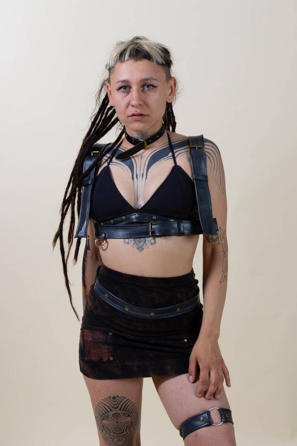 Das flexible Gummimaterial passt sich dem Körper an und bietet gleichzeitig festen Halt. Ob als modisches Statement, für Festivals, Performances oder den Alltag – dieses Harness ist ein echter Blickfang mit Haltung.