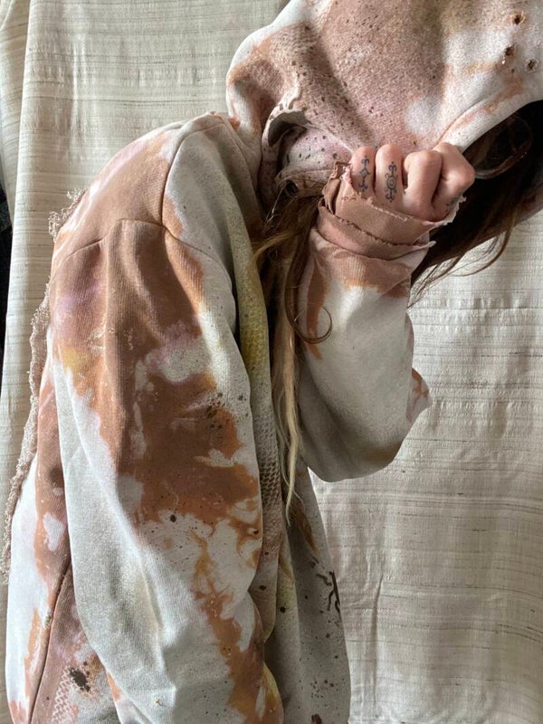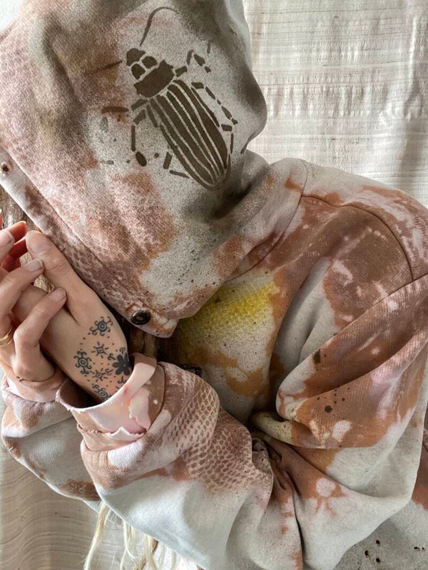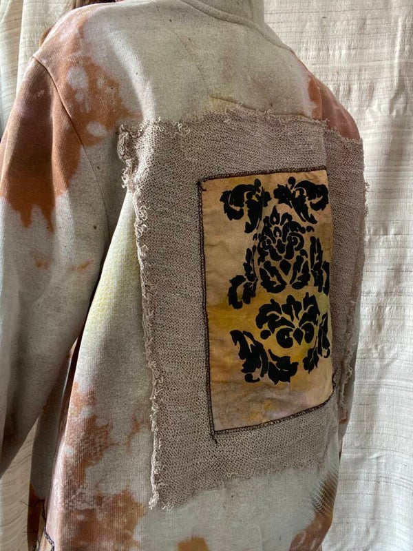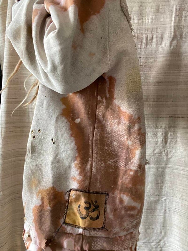 hand bleached and dyed hoodie with hand made patches.